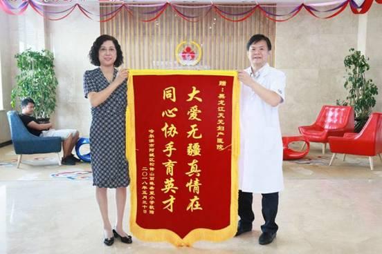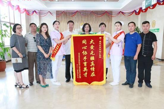 2018年6月13日,农工党黑龙江省委会驻会副主委刘长青的带领下,农工党黑龙江省委和松锋山镇丽珠希望小学的领导来到我院,送来匾额和锦旗,感谢我院给哈尔滨市阿城区松锋山镇丽珠希望小学教职员工进行免费体检,感谢我院对丽珠希望小学教职员工的关爱和体贴。